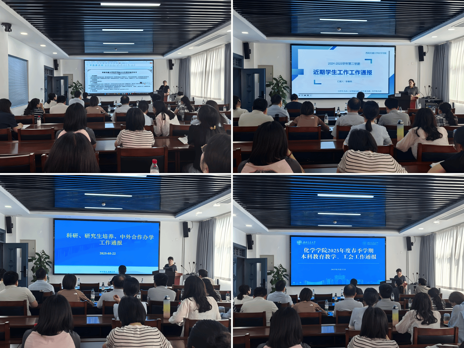 王雅雯副院长通报学院近期本科教学和工会工作,介绍学院在学风建设、大学生科创项目、人才培养工作任务绩效核算方面的进展,通报学校2025年秋季学期排课要求和2025届本科毕业设计(论文)答辩安排;并代王勇副院长介绍近期学院在推进科研管理、研究生培养、中外合作办学等方面所开展的工作。