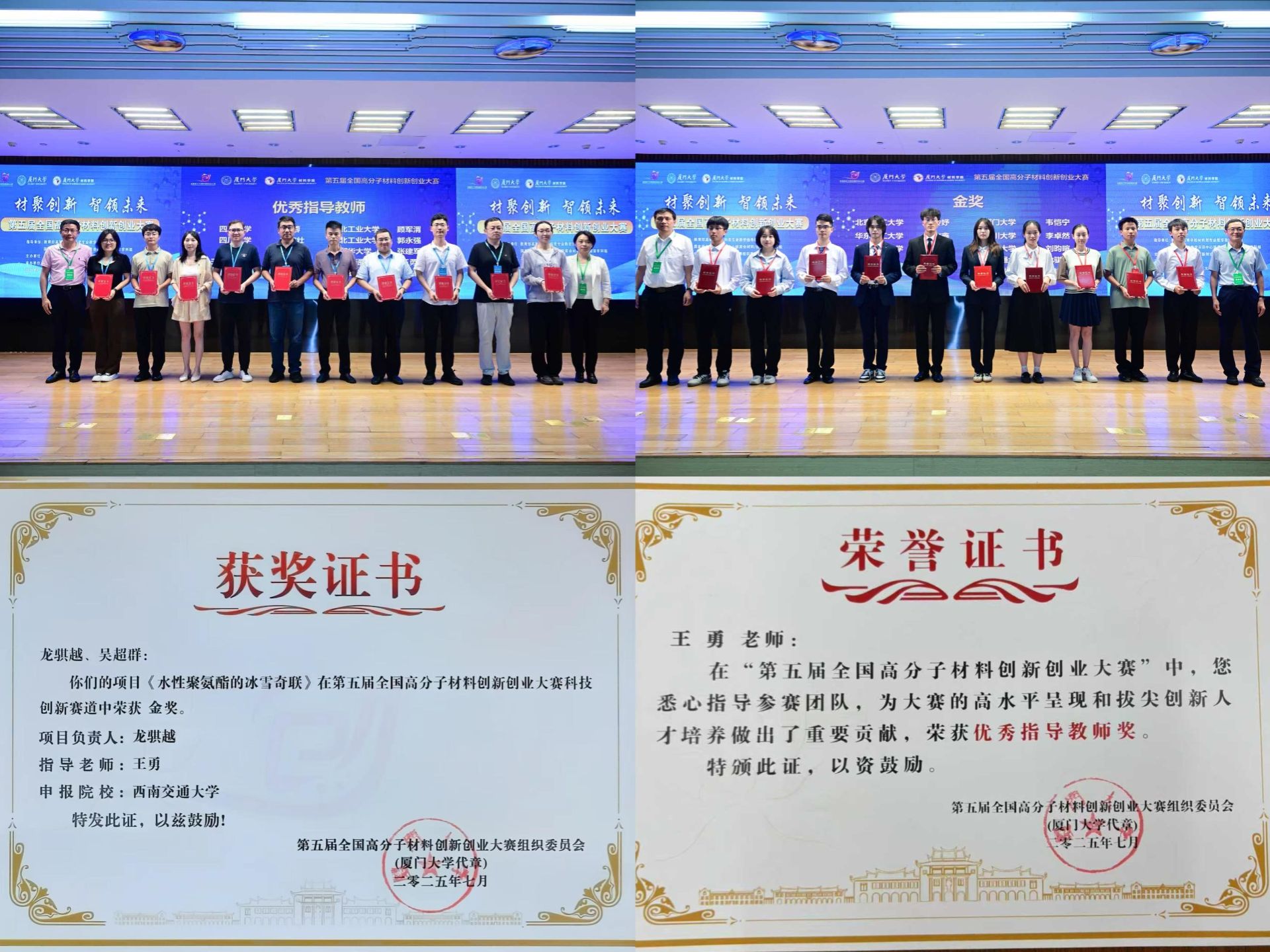 龙骐越、吴超群同学在王勇教授的悉心指导下,《水性聚氨酯的冰雪奇联》项目斩获“科技创新赛道金奖”,王勇教授荣获“优秀指导教师奖”。