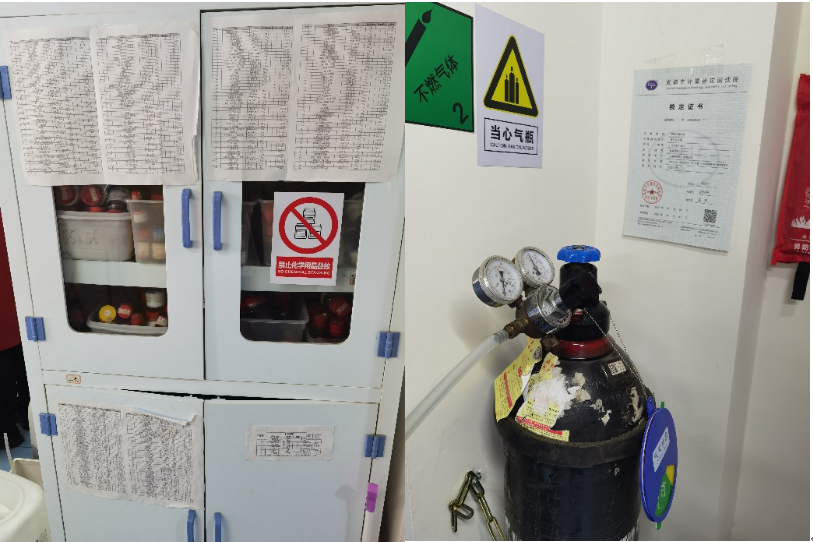 检查发现绝大部分实验室干净整洁,运行规范,实验场所均张贴了安全信息牌,配备了合适的灭火设备,并且均在有效期内;存在燃烧和腐蚀风险的实验区域配置了应急喷淋和洗眼装置;实验人员均穿着实验服,戴手套;试剂库房双人双锁,台账清晰;气瓶合理固定,并挂好状态牌;化学废弃物有暂存区,存放规范。
