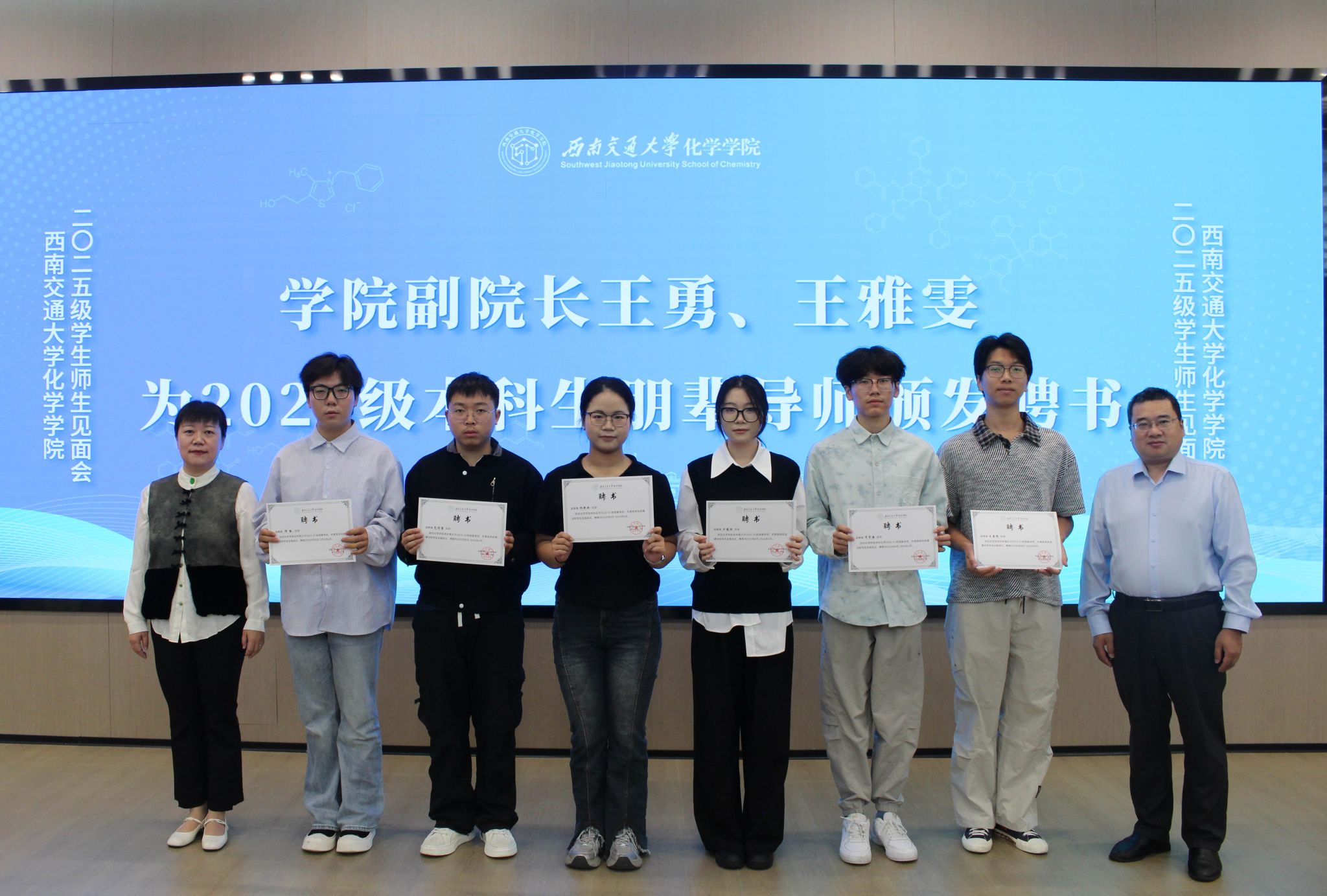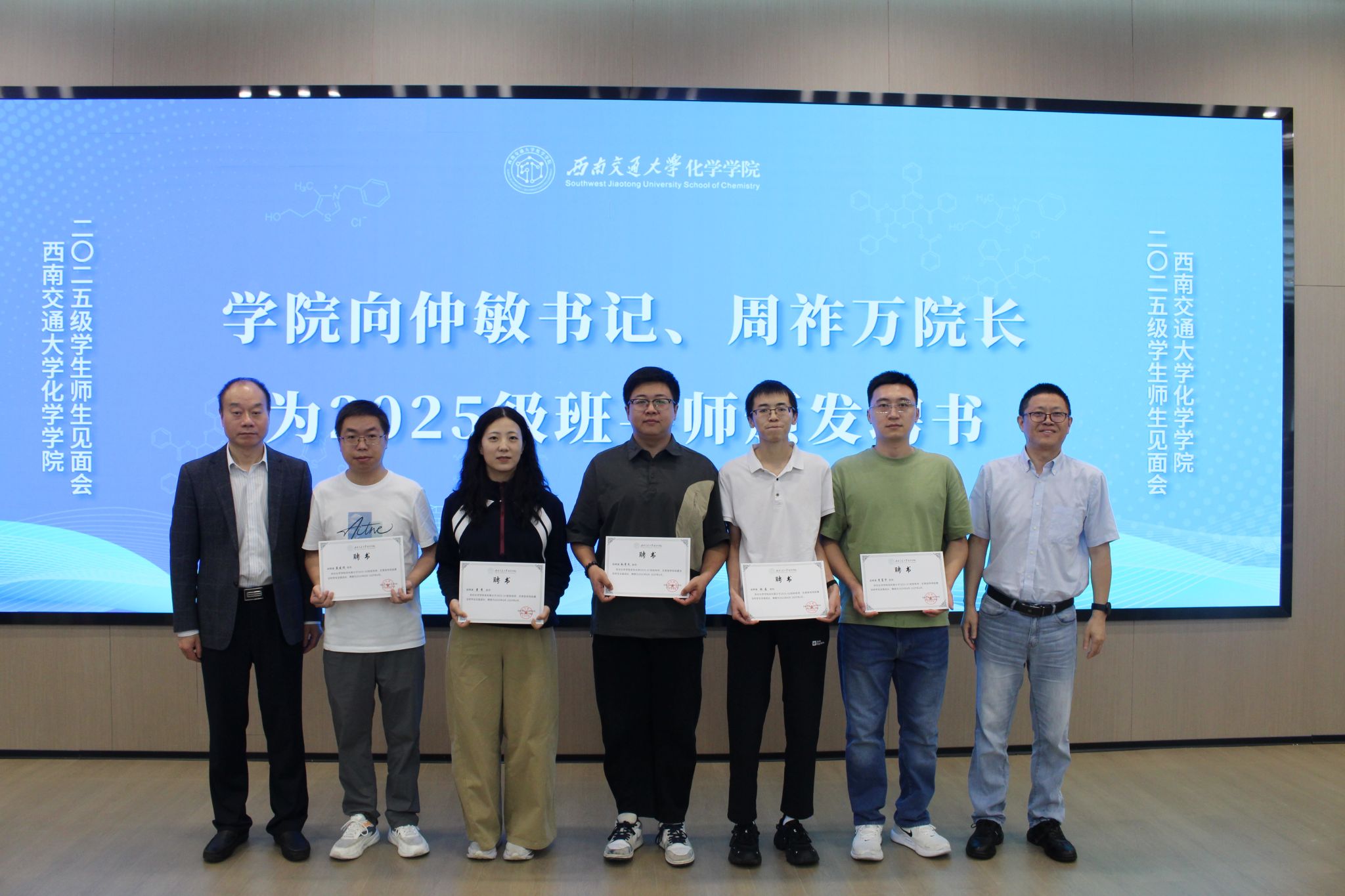 向仲敏书记、周祚万院长共同为班导师颁发聘书,王勇副院长、王雅雯副院长为朋辈导师颁发聘书。现场掌声不断,既体现了学院对新生培养的重视,也赋予了导师们沉甸甸的责任。