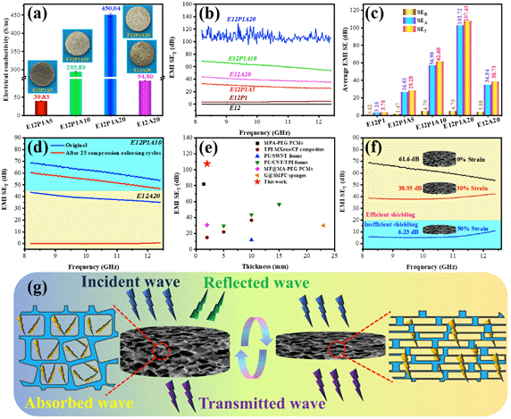 图2. (a)EPA和EVA@Ag泡沫的电导率,(b)不同样品的EMI SET-频率曲线,(c)不同样品的平均SER、SEA和SET,(d)E12P1A10和E12A20样品压缩/回复循环前后的SET,(e)本工作与过去报道的形状记忆泡沫基EMI屏蔽材料之间的屏蔽性能比较,(f)E12P1A10样品在不同压缩应变下的平均SET,(g)可调EMI屏蔽机理示意图。