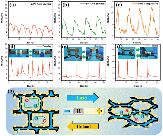 图3. (a-c) E12P1A20样品在2.5%(a)、5%(b)和10%(c)预设应变下的相对电阻变化,(d-f) 按压(d)、弯曲(e)和扭转(f)动作对应的电信号,(g) 应变传感机理示意图。
