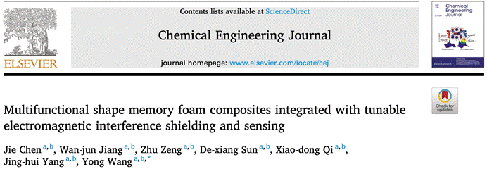 综上,本研究以EVA泡沫为形状记忆骨架,分别通过气相聚合和化学镀在EVA泡沫表面涂覆PPy和AgNPs,在保证泡沫自身具有优异EMI屏蔽性能的同时,通过控制形状记忆效应实现了自固定SE调节。本工作为制备高性能智能EMI屏蔽材料的结构设计提供了新的思路。相关成果以“Multifunctional shape memory foam composites integrated with tunable electromagnetic interference shielding and sensing”为题发表在Chemical Engineering Journal (DOI: 10.1016/j.cej.2023.143373)。论文的第一作者为2021级博士研究生陈杰,通讯作者为91黑料