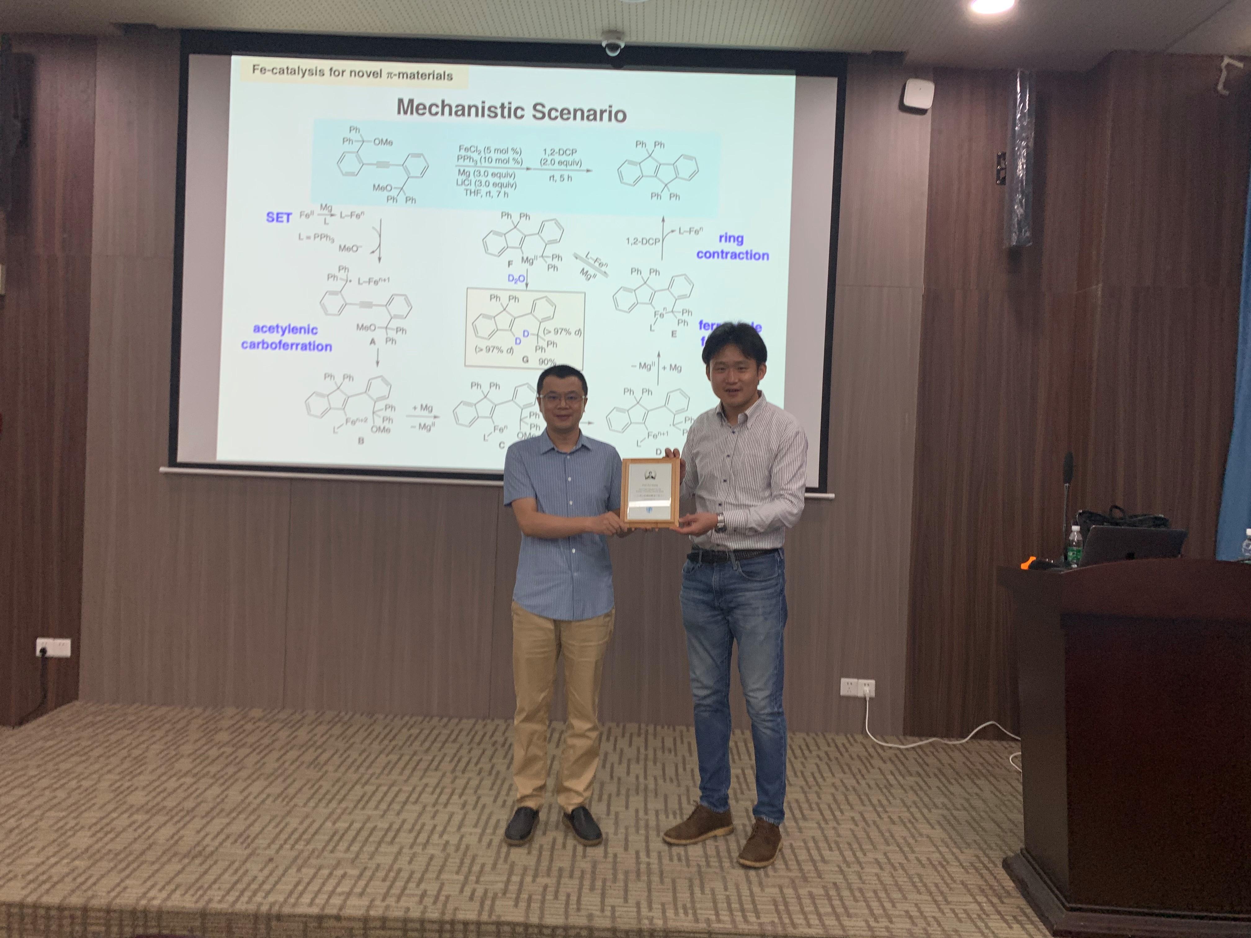报告中,尚睿教授首先介绍了他的研究领域:包含可持续催化与材料科学,在可持续催化领域,他的兴趣点在丰产且廉价的铁催化及光催化;而在材料科学领域则是有机光电π-结构材料。随后介绍了他课题组所发展的一系列廉价金属Fe催化的C-H键官能团化反应与响应反应机理研究,以及基于课题组所发展的Fe催化新反应在有机光电π-结构材料方面的研究进展。在Fe催化体系下可快速高效的合成一系列具有二噻吩骨架的新型有机光电材料,并且这类材料在近红外光电探测器器件及有机太阳能电池中表现出优异的性质,具有广阔的应用前景。