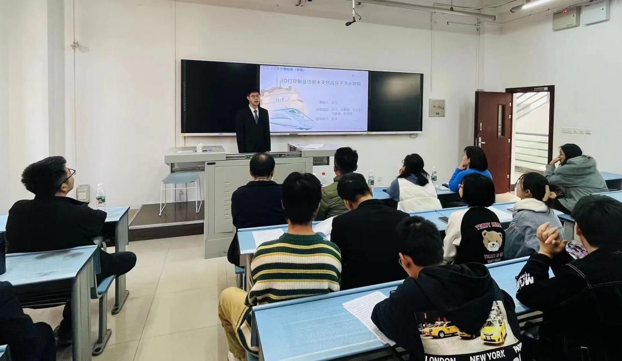 (图3 姜曼老师指导的《3D打印制备仿树木天然高分子复合净水材料》项目成员答辩)