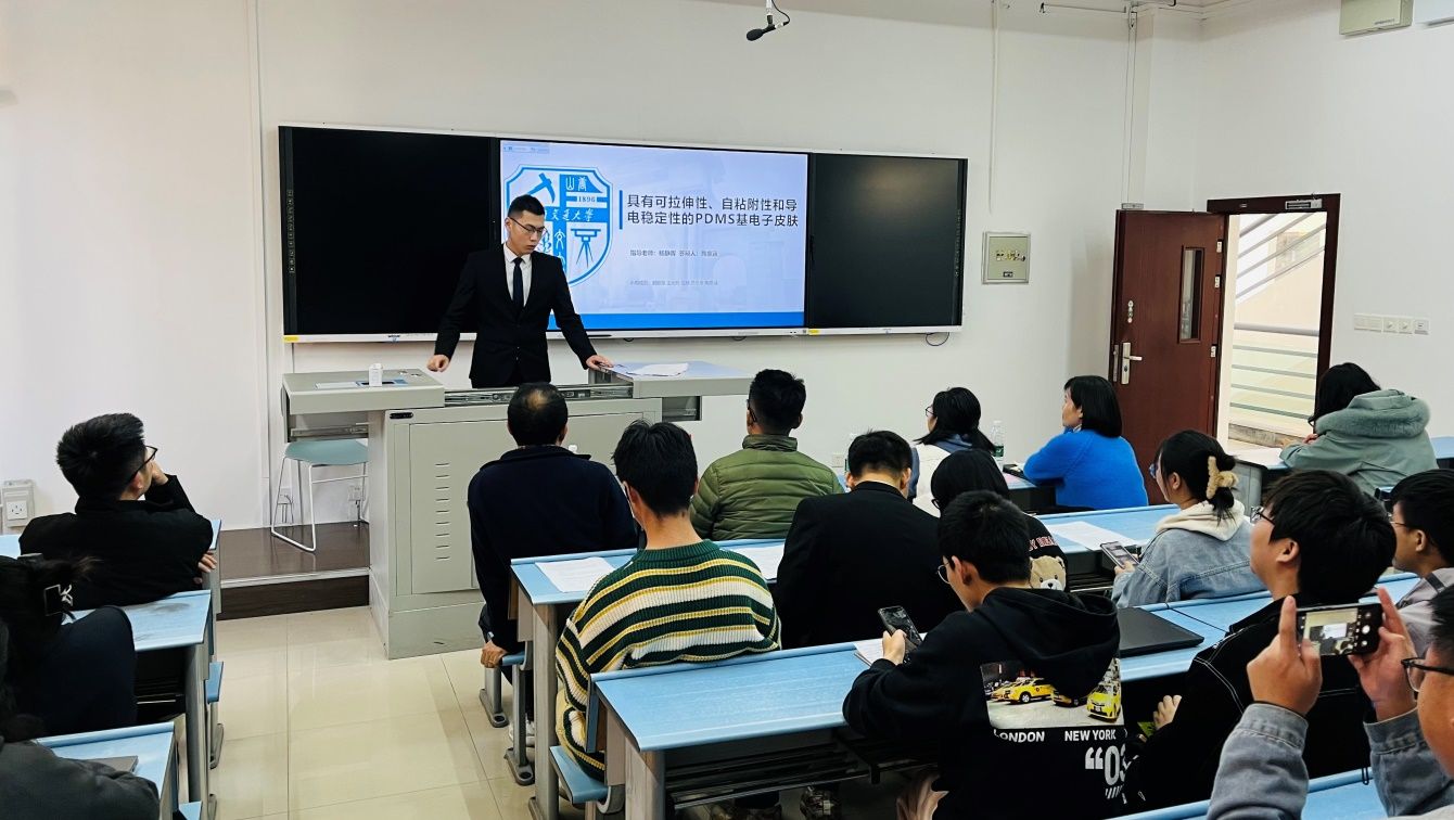 (图8 杨静晖老师指导的《具有可拉伸性、自粘附性和导电稳定性的PDMS基电子皮肤》项目成员答辩)