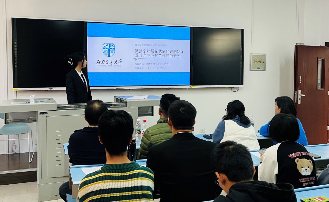 (图4 徐晓玲老师指导的《氮掺杂片层花状氧化锌的制备及其光响应抗菌性能的研究》项目成员答辩)