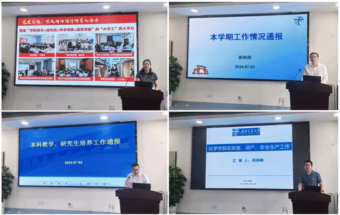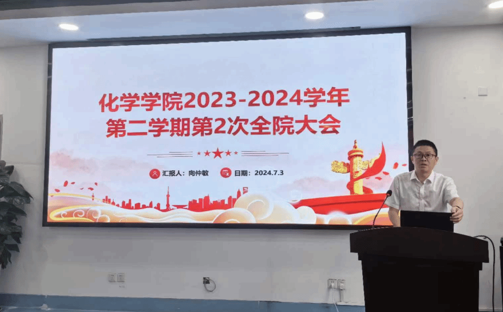 会议第二阶段,学院领导按照分管业务向全体教职工通报2024年春季学期院情。该阶段由向仲敏书记主持。首先,向书记介绍了学院新聘任的五位教师,并代表学院对新教师的加入表示热烈欢迎。随后,向书记从扎实推进党纪学习教育、党政协力促进学院高质量发展、深入师生践行和谐学院文化等方面作党建工作汇报。向书记强调,学院将做好党纪学习教育后续工作,充分发挥党建引领作用,加强学院师德师风建设,落实落细暑假期间学院师生意识形态和安全稳定工作。