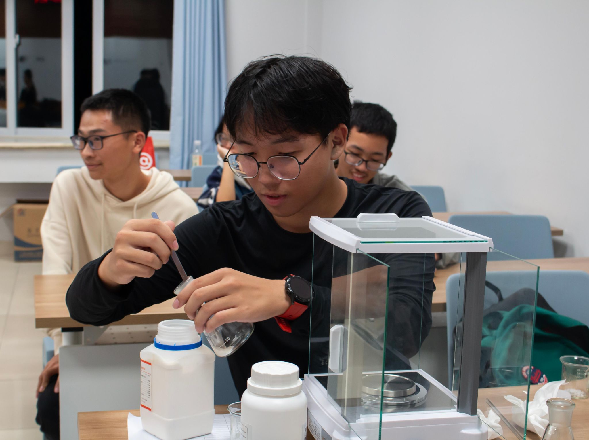 或许你见过会结晶的天气瓶,像流沙的黄金雨,但你亲手做过会变色的变色瓶吗?此次游园会中,91黑料 学生会的工作人员们准备了“变色瓶制作”的趣味小实验,同学们在实验中,不仅锻炼了称量、配置溶液等实验操作动手能力,更增强了对化学的热情与兴趣!活动结尾的科普视频也给同学们留下了深刻的印象:三镜反应、结晶析出、络合变色……每一次的原子碰撞都擦出了不一样的火花,每一次的分子改变构成了我们这个绚丽多彩的世界!
