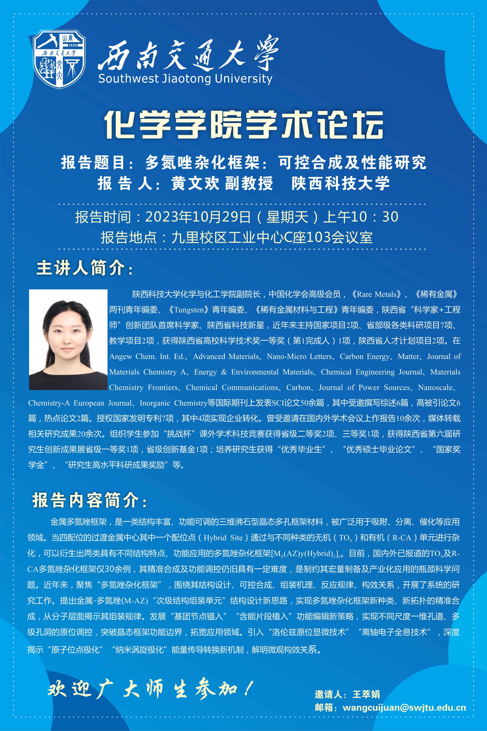 报告题目:多氮唑杂化框架:可控合成及性能研究