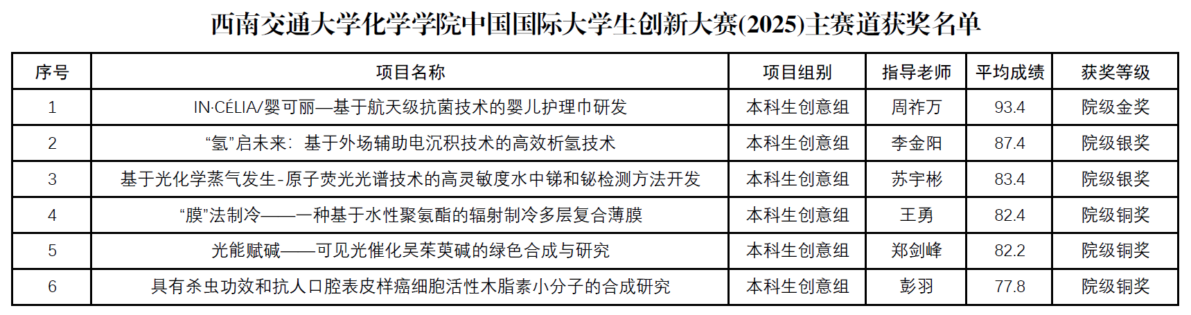 关于启动中国国际大学生创新大赛(2025)主赛道院内选拔赛的通知》,经公开报名、合题性审核、规范性评审,共确定6支院级获奖队伍(其中金奖、银奖推荐参加校级选拔赛),现将名单予以公示。