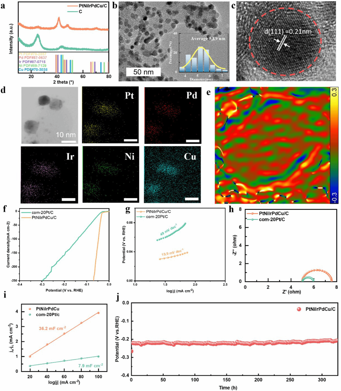 图5:PtPdIrNiCu/C催化剂的结构、成分表征及电催化析氢性能