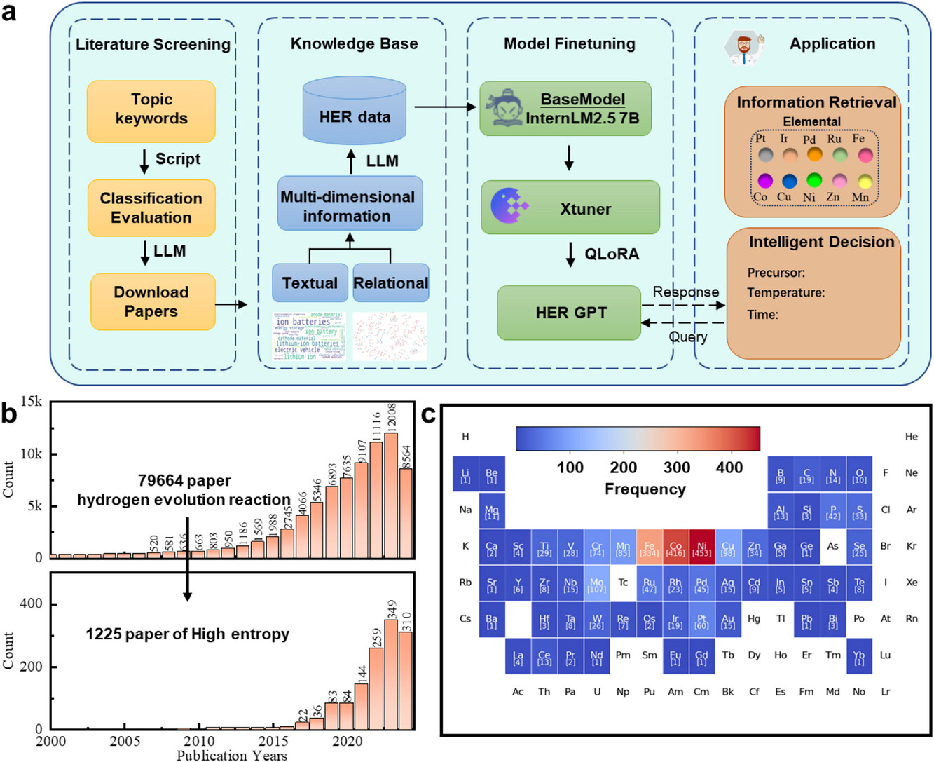 基于LLMs的文献分析框架(图2a)包含文献筛选、知识库构建、模型微调与应用四个阶段。通过Web of Science数据库检索7.9万篇文献,经出版年份(2000-2024)、引用率(>10次/年)及LLMs二次筛选,最终获得1225篇HEA相关研究(图2b)。统计发现,非贵金属中Fe、Co、Ni出现频率最高(图2c),而贵金属中Pt占比显著。基于此,研究选择Pt为基底,结合高频元素构建候选库。通过InternLM 2.5模型与低秩自适应(LoRA)微调,模型可智能推荐HER活性元素及实验策略,实现从海量文献到实验设计的闭环优化。