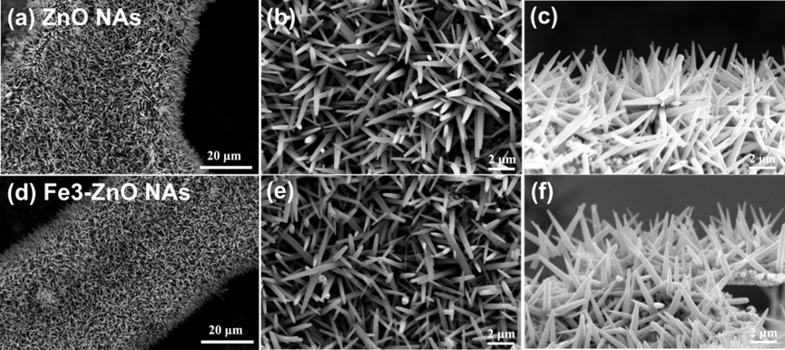 图 2. 在铜泡沫上生长纳米阵列的扫描电子显微镜形态图。(a-c)ZnO NAs的扫描电子显微镜图像,(d-f)Fe3-ZnO NAs的扫描电子显微镜图像。