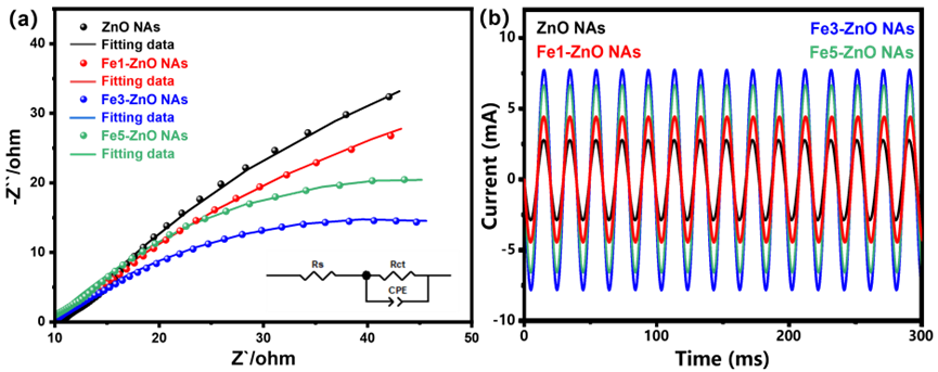 图 5. ZnO NAs和Fe-ZnO NAs电极的电化学性能。(a)ZnO NAs、Fe1-ZnO NAs、Fe3-ZnO NAs和 Fe5-ZnO NAs电极的奈奎斯特图及拟合线(由插入的等效电路模拟所得),(b)ZnO NAs、Fe1-ZnO NAs、Fe3-ZnO NAs和 Fe5-ZnO NAs电极的电流测试。