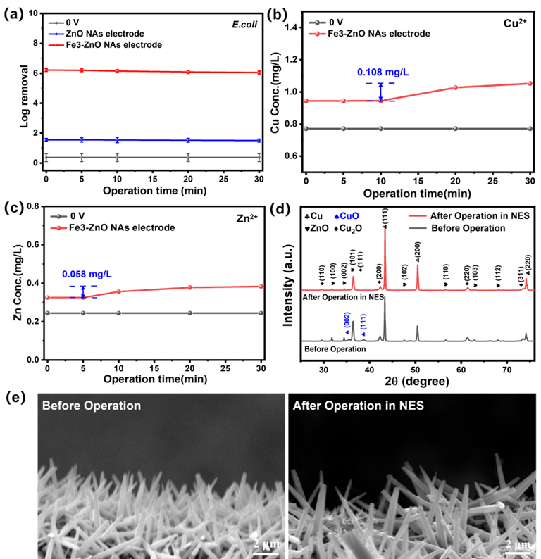 图 7. 电极稳定性测试及电极降解分析。(a)ZnO NAs 电极和 Fe3-ZnO NAs 电极的长期消毒性能(大肠杆菌浓度为 106 CFU/ml,1 V 直流电),(b)Fe3-ZnO NAs 电极运行 30 分钟时出水中 Cu2+ 的浓度,(c)Fe3-ZnO NAs 电极运行 30 分钟时出水中 Zn2+ 的浓度,(d)Fe3-ZnO NAs 电极运行前后的 XRD 图谱,(e)Fe3-ZnO NAs 电极运行前后的 SEM 形貌。