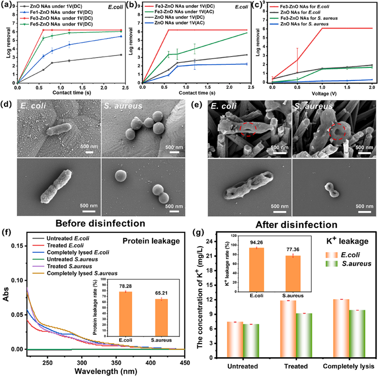 图 6. Fe-ZnO NAs电极的消毒效果及细菌膜损伤评估。(a)在 1 V直流电压作用下,不同接触时间(细菌浓度为 106 CFU/ml)下 ZnO NAs、Fe1-ZnO NAs、Fe3-ZnO NAs和 Fe5-ZnO NAs电极对大肠杆菌的消毒效率;(b)在 1 V直流/交流电压作用下,不同接触时间(细菌浓度为 106 CFU/ml)下 ZnO NAs和 Fe3-ZnO NAs电极对大肠杆菌的消毒效率;(c)不同电压(0~2 V直流)下 ZnO NAs和 Fe3-ZnO NAs电极对大肠杆菌和金黄色葡萄球菌(细菌浓度为 106 CFU/ml)的消毒效率;(d)用 Fe3-ZnO NAs电极消毒前大肠杆菌和金黄色葡萄球菌的扫描电子显微镜图像;(e)用 Fe3-ZnO NAs电极消毒后大肠杆菌和金黄色葡萄球菌的扫描电子显微镜图像;(f)灭活细菌内部蛋白质的泄漏率;(g)灭活细菌中钾离子的泄漏率。