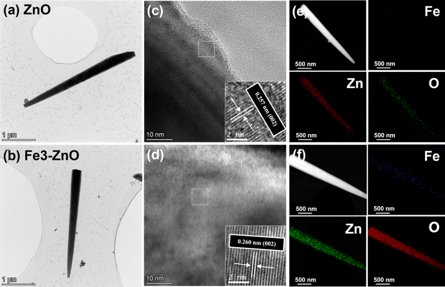 图 3. 单根纳米棒的透射电子显微镜(TEM)、高分辨率透射电子显微镜(HRTEM)和能谱分析(EDS)图像。(a)ZnO,(b)Fe3-ZnO的TEM 图像;(c)ZnO,(d)Fe3-ZnO的HRTEM 图像;(e)ZnO,(f)Fe3-ZnO的EDS元素分布图。