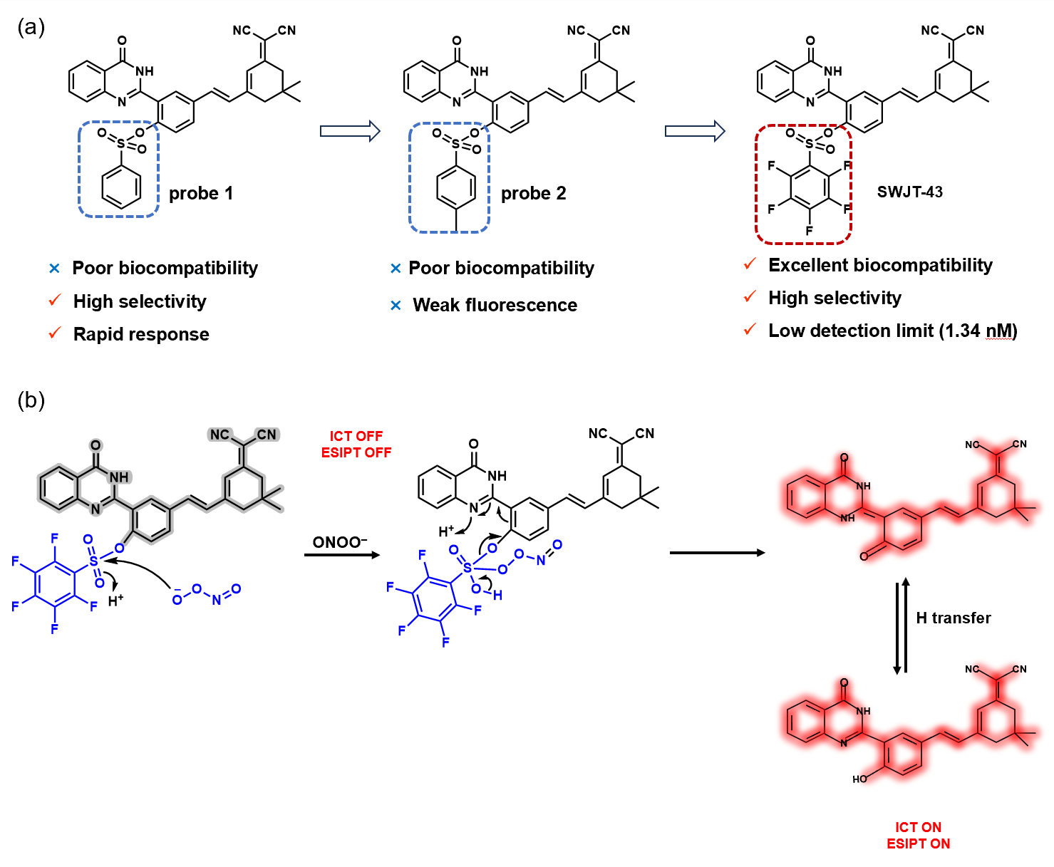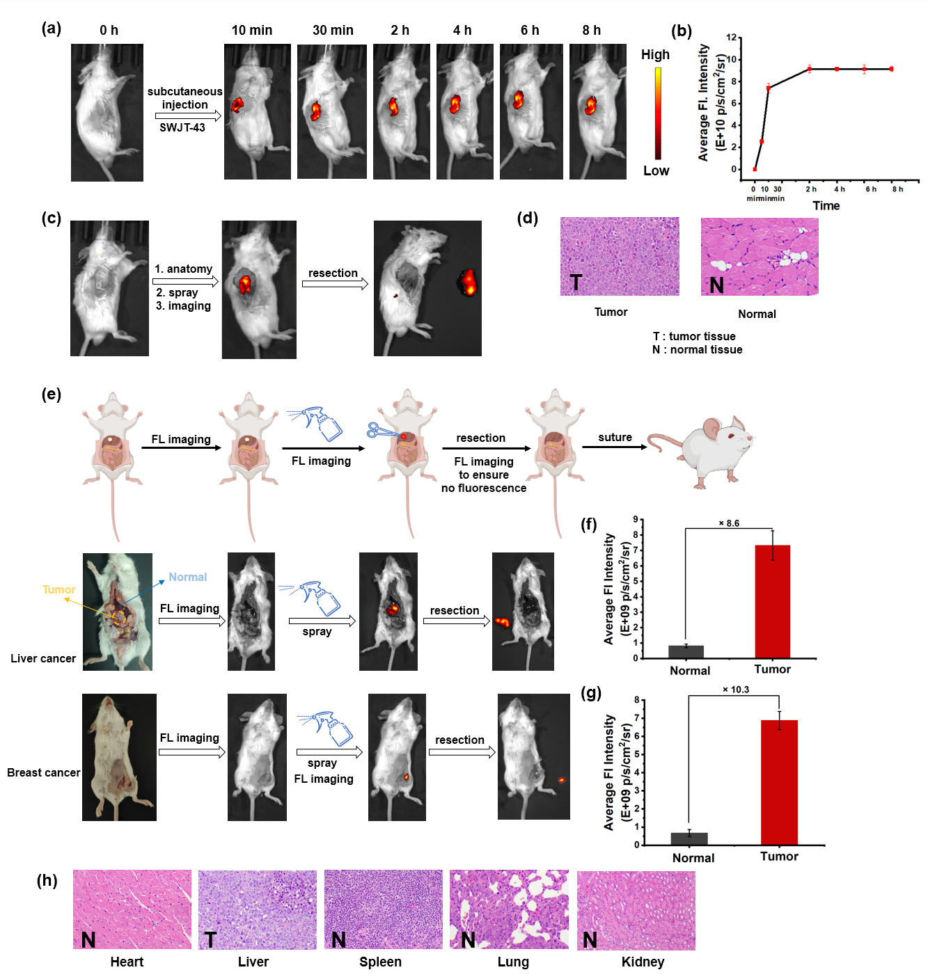 王雅雯教授团队成功开发了一种双氰基异佛尔酮和2-(2′-羟基苯基)-4(3H)-喹唑啉酮(HPQ)的杂化骨架构建了一种可激活的近红外固态荧光探针(SWJT-43),具有高光稳定性和低背景干扰的特性。其通过特异性响应肿瘤微环境中过表达的过氧亚硝酸盐(ONOO⁻),实现对癌细胞的高灵敏度、高选择性检测,检测限低至1.10 nM。在实验中,SWJT-43成功应用于肝癌和乳腺癌细胞的长期原位成像,并能通过实时荧光差异快速区分癌变组织与正常组织。在动物模型中,该探针实现了对小鼠原位肝癌及乳腺癌肿瘤的特异性标记,为精准手术切除提供可靠的荧光导航,显著提升了手术的准确性。