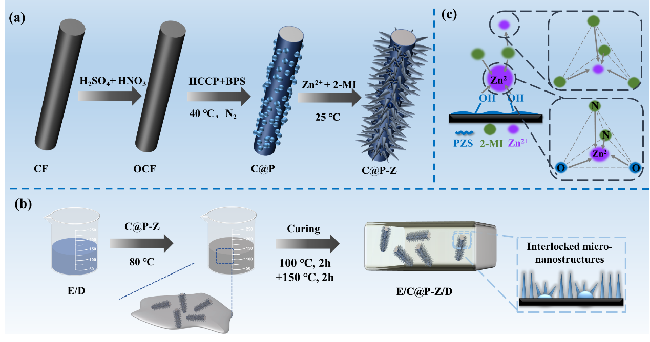 图 1.(a) CF 修饰示意图;(b) 复合材料制备过程示意图;(c) ZIF-8 和 PZS 相互作用的示意图。