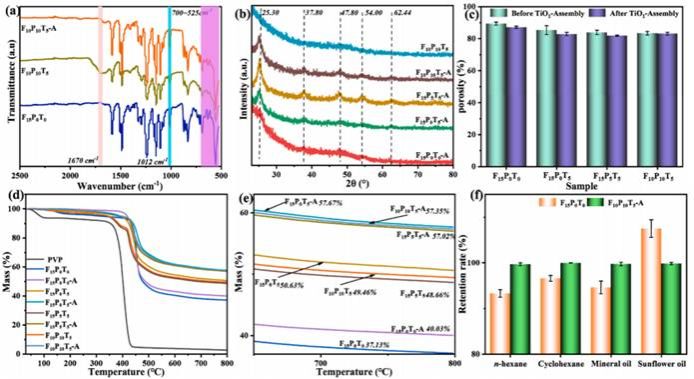 图2 FPT-A纤维膜的(a)红外光谱图、(b) WAXD图、(c)孔隙率、(d, e) TGA曲线和(f)复合膜对油的抵抗能力