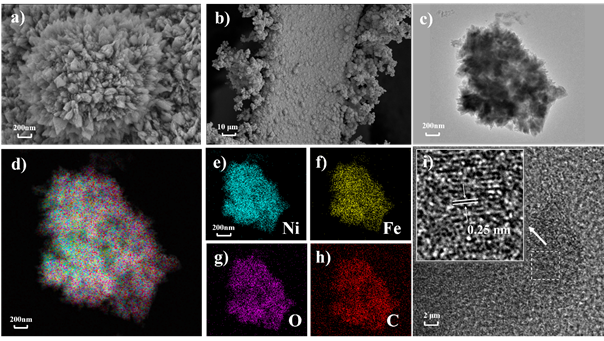 图2. 催化剂NFBF (6:2) 的(a–b) SEM, (c, i) TEM, 以及 (d-h) EDS mapping 图。