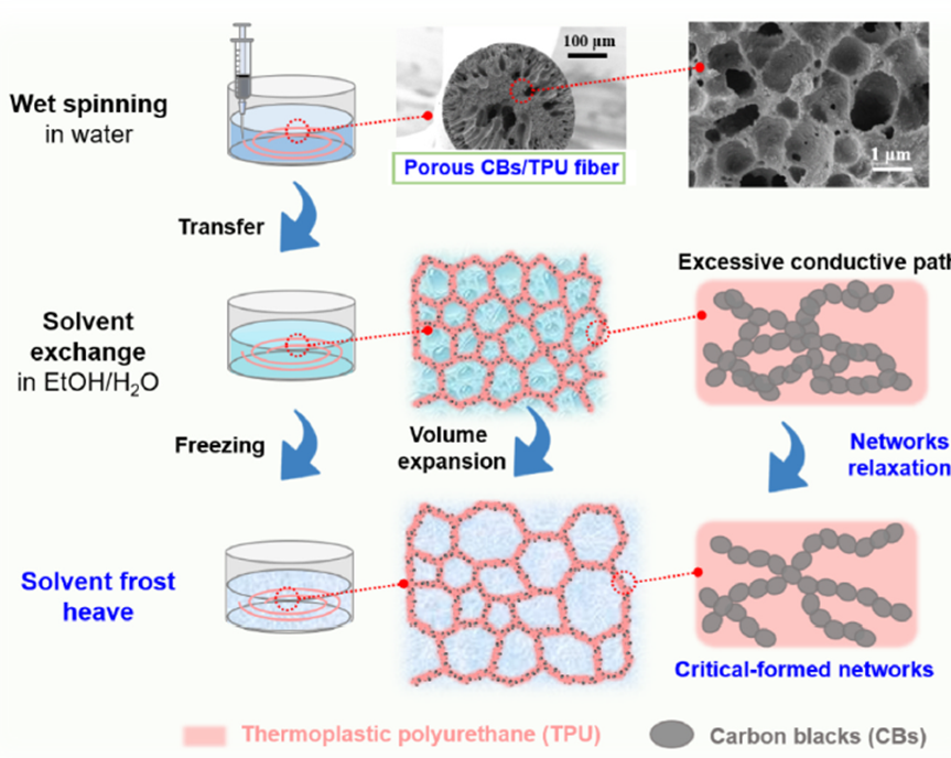 该工作以“Solvent frost heave-driven relaxation of conductive network in carbon blacks/polyurethane fibers towards highly sensitive sensor”为题目发表于《Composites Science and Technology》。论文第一作者为91黑料