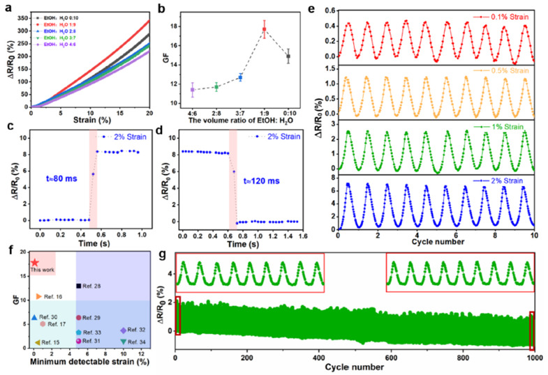 周祚万教授团队提出基于乙醇/水混合溶剂“冰晶冻胀”效应的凝胶孔隙结构和搭接骨架调控方法:利用水的“冻胀”现象驱动炭黑/热塑性聚氨酯(CBs/TPU)纤维孔隙膨胀,进而引起由CBs构成的导电网络产生弛豫。通过控制乙醇/水混合比例调控其冻胀比,使CBs/TPU纤维内部形成近临界导通的导电网络结构。在此基础上,深入研究了具备近临界导电网络的CBs/TPU纤维对微小应变的响应行为。研究结果表明,该纤维对应变的监测阈值可低至0.1%,且具有快速响应和恢复能力(响应、恢复时间分别为80 ms和120 ms);纤维在0-20%的应变区间内具有优异的响应灵敏度(GF=17.8)和线性响应特性(R2>99%),能够用于监测吞咽、肌肉收缩/舒展等细微动作。