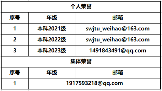 2.集体荣誉:班级班长网上申请成功后,需于10月8日12:00前将主要申请材料证明,电子版打包命名为:班级-先进/特色班集体(例:高分子2021-01班-先进班集体),电子版材料发送至指定邮箱,纸质版复印件提交至X2413B各年级辅导员处。