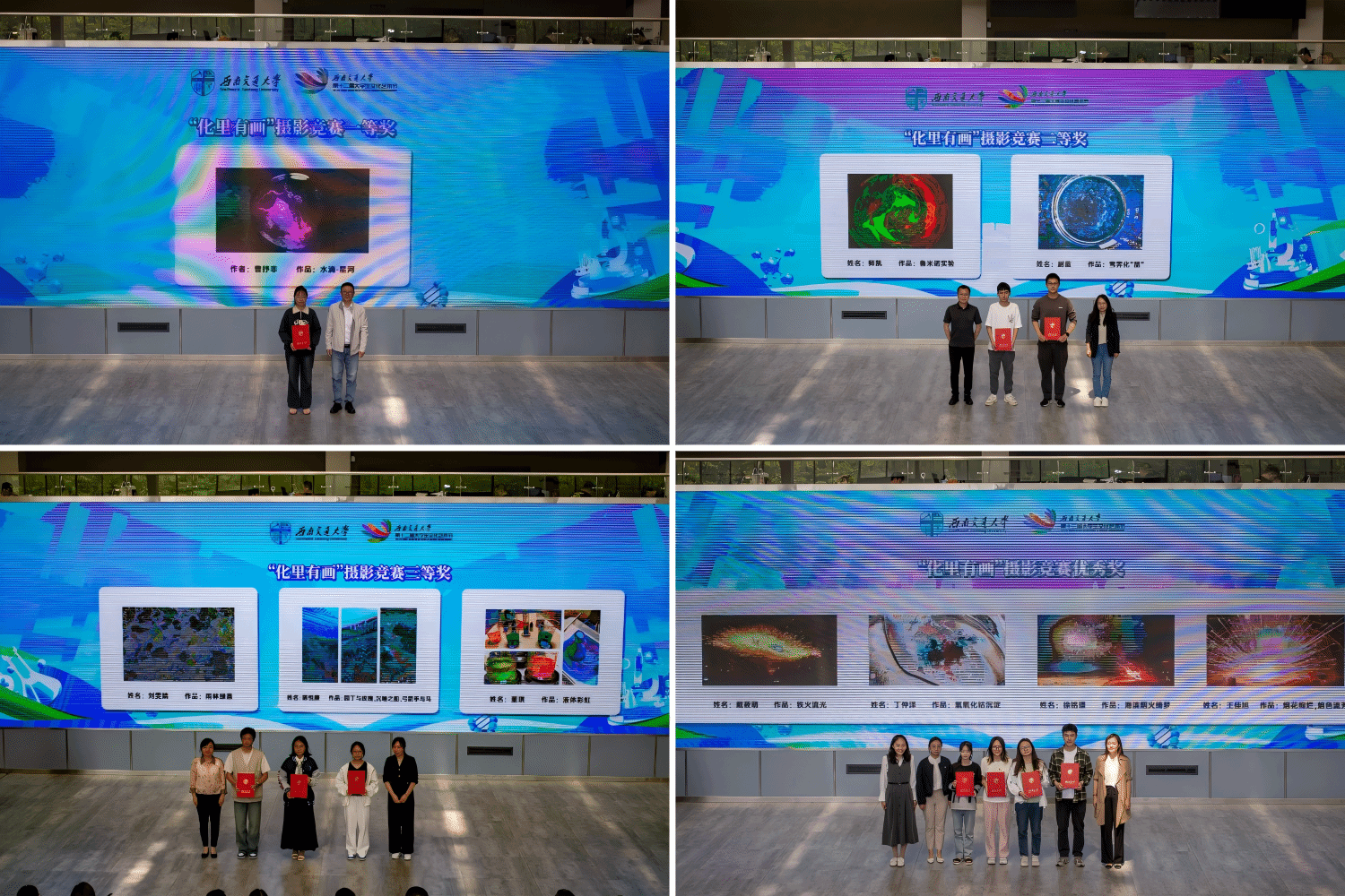 为鼓励全校学生以影像为媒,发掘潜藏于科研实践中的美学密码,活动特别开展了“化里有画”摄影作品竞赛活动。全校100余名学生积极参与,他们走进实验室、走在校园,用镜头语言诠释“知行合一”的深层魅力。经学校师生代表评审,共评选出一等奖1名、二等奖2名、三等奖3名和优秀奖4名,开幕式现场举行了颁奖仪式。