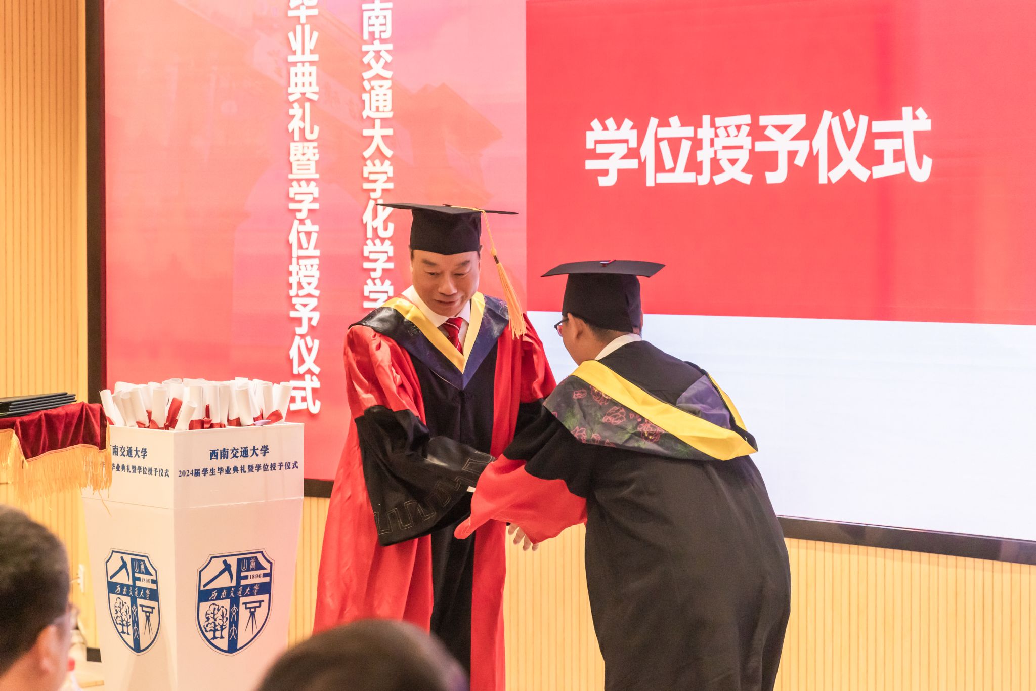接着,学院举行了2024届学生学位授予仪式。周祚万院长逐一为2024届博士毕业生、硕士毕业生、本科毕业生授位。毕业生们依次上台接受院长拨穗授礼,并合影留念。