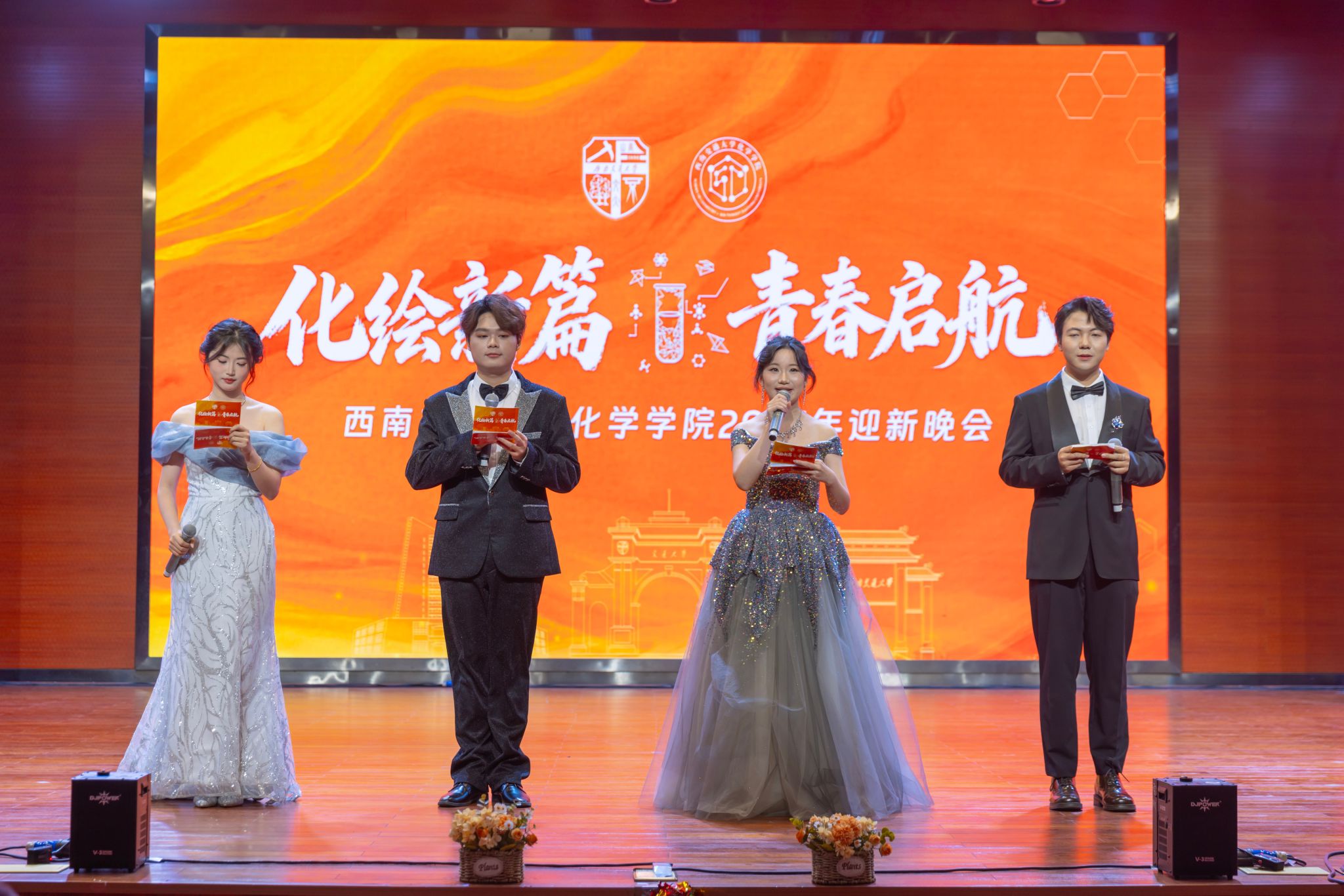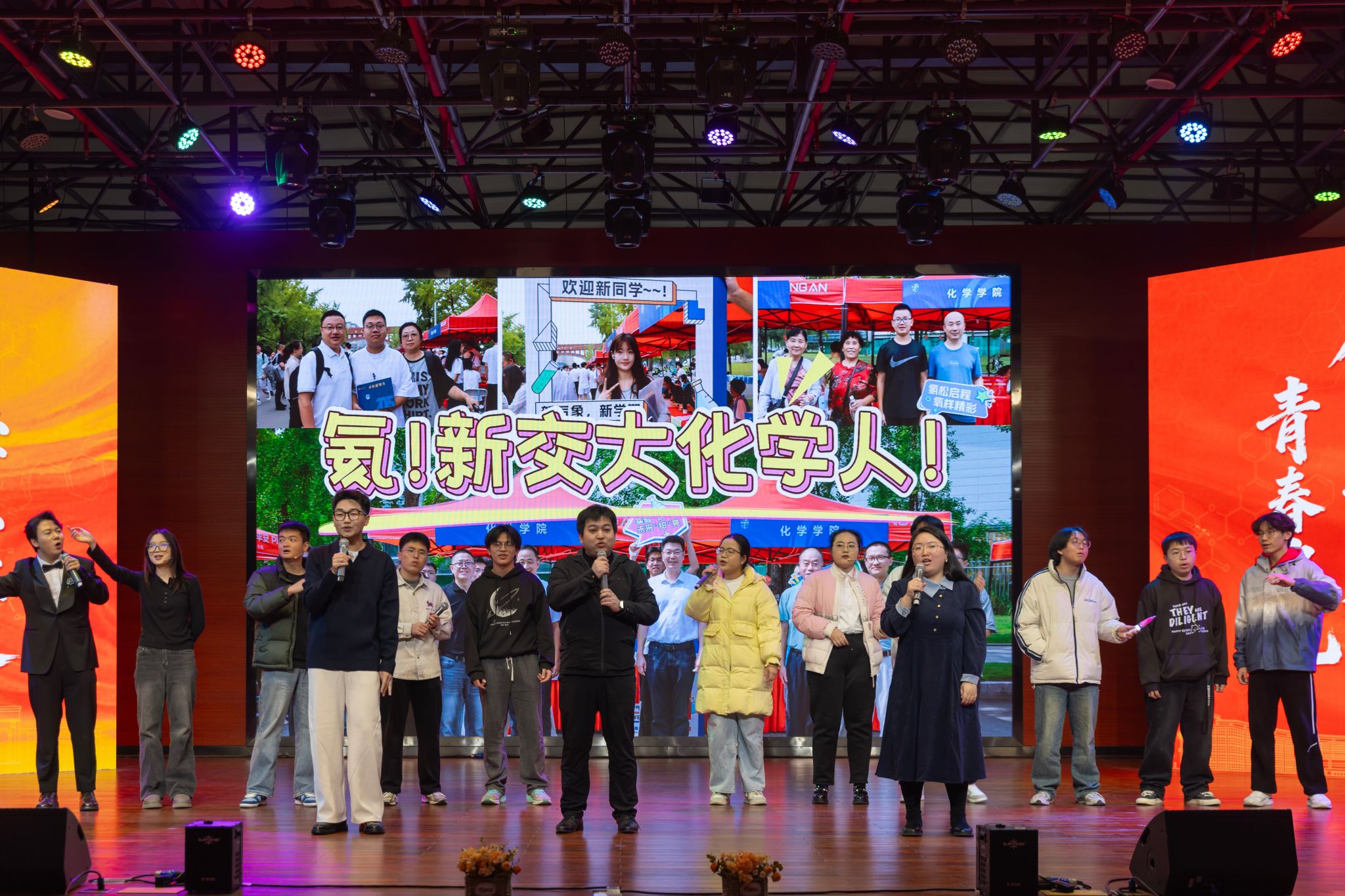 初心凝聚,共赴新程。学院全体辅导员、新生朋辈导师及辅导员助理率先登台,合唱《我的未来式》,既饱含着对2025级新生的殷切期许,更传递着对学院未来发展的无限憧憬,为晚会拉开温暖而热烈的序幕,恰如试剂交融,撞碎未知的迷茫,让旧识与新友在此刻点燃璀璨星火。
