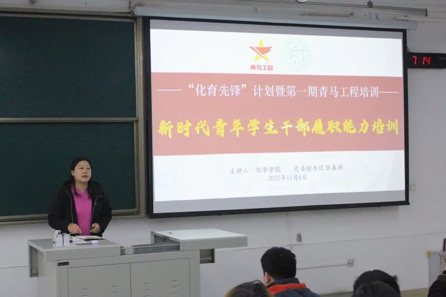 学院党委始终将“青马工程”作为培养青年政治骨干的重要抓手。开班仪式后,学院党委副书记、青年讲师团成员张春燕以“理论高度+实践温度”为核心,为学员们讲授了一堂立意深远、内涵丰富的思政课。她从学生干部的角色定位、能力提升与成长规划三个维度,系统阐释了新时代青年践行马克思主义的核心要义,引导学员们深刻认识到“青马学员”不仅是一份荣誉,更是一份责任。她鼓励大家将个人专业理想融入国家科技发展大局,在化学科研与服务奉献中锤炼品德修为、练就过硬本领,努力成长为“有理想、敢担当、能吃苦、肯奋斗”的新时代青年马克思主义者,为实现中华民族伟大复兴的中国梦贡献青春智慧。